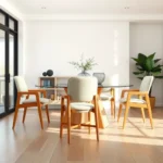 - Обеденный стол: Может быть круглым с массивной мраморной или стеклянной столешницей на хромированном или латунном основании. Прямоугольный стол из лакированного дерева с металлическими ножками также будет выглядеть стильно.